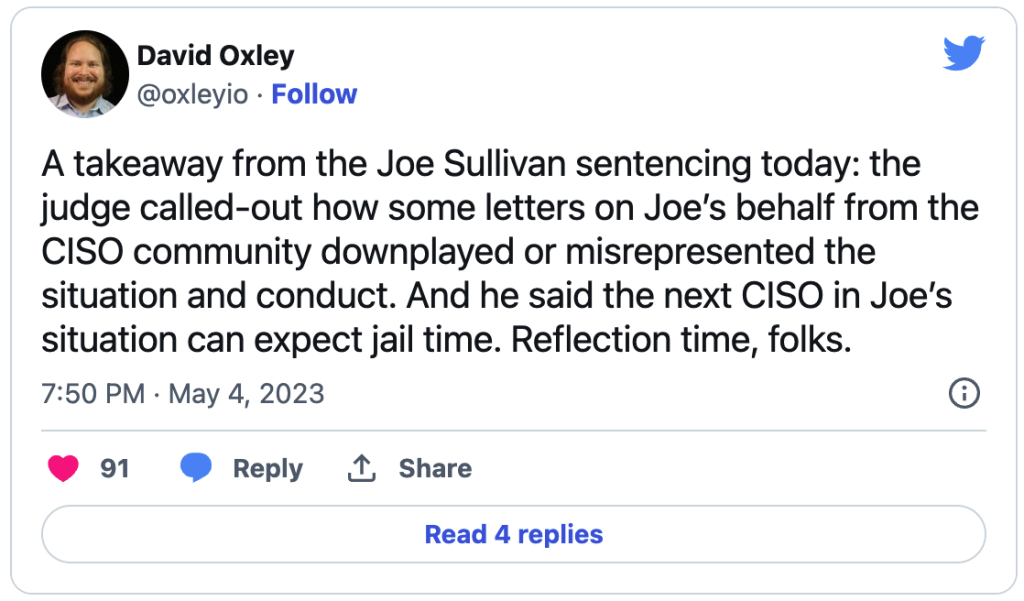 Mas o juiz levou em consideração o trabalho anterior de Sullivan para proteger a segurança digital das pessoas, as muitas cartas apresentadas por amigos e membros da comunidade de segurança cibernética pedindo clemência neste caso, bem como a contrição demonstrada de Sullivan, e chegou a uma sentença que não envolve passar tempo na prisão.