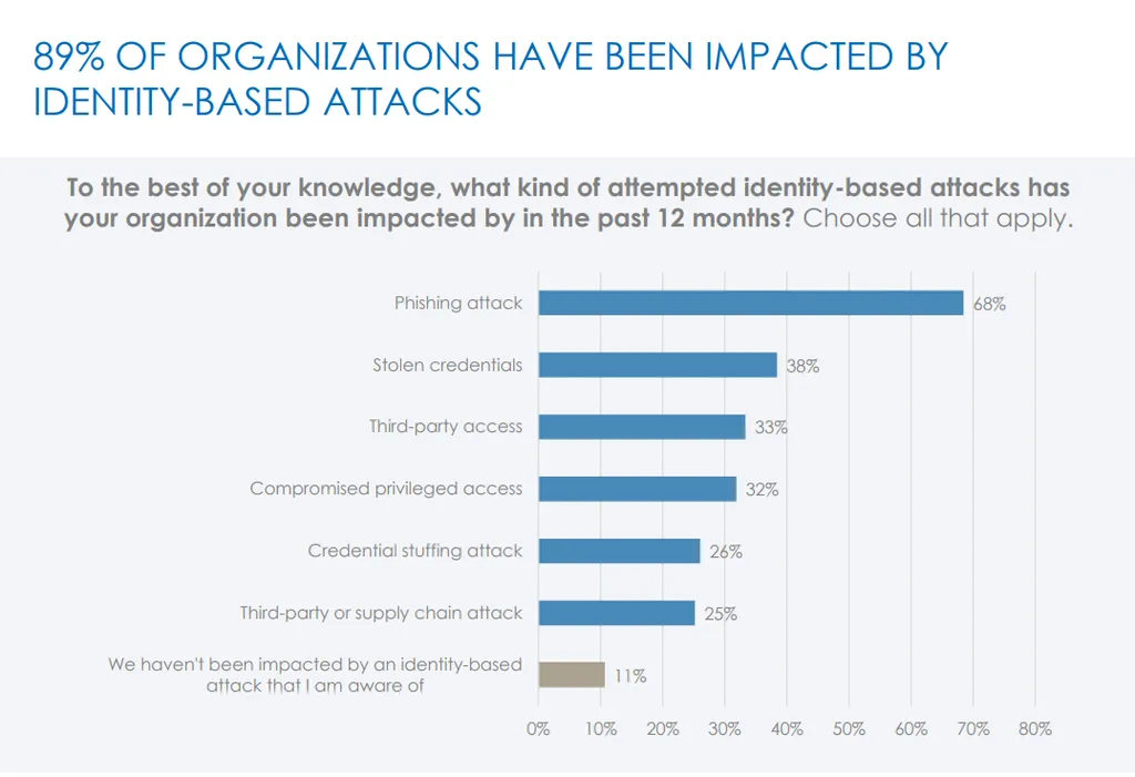 O gráfico acima revela que quase 9 a cada 10 organizações foram impactadas por ataques baseados em privilégio de acesso no ano passado, com quase 70% das empresas sofrendo um ataque de phishing. Segundo 80% dos entrevistados, os impactos dos ataques poderiam ter sido evitados com o uso de melhores ferramentas de gerenciamento.