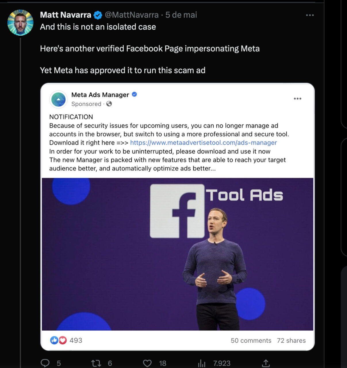 O consultor Matt Navarra verificou pela primeira vez alguns dos anúncios, compartilhando-os no Twitter. As contas comprometidas incluem páginas que parecem oficiais, como “Meta Ads” e “Meta Ads Manager”. Essas contas compartilhavam links suspeitos para dezenas de milhares de seguidores, embora seu alcance provavelmente se estendesse muito além disso por meio de postagens pagas.