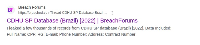 No ano passado, já havia um vazamento de dados da CDHU anunciado no site de venda de dados ilegais na dark web BreachForums, mas nossa reportagem não conseguiu confirmar se se tratava do mesmo banco de dados (veja abaixo). Contudo, um pesquisador de cibersegurança ouvido pela reportagem sob a condição de anonimato disse que no dia 6 de dezembro do ano passado teve conhecimento de que estava havendo um vazamento da CDHU.